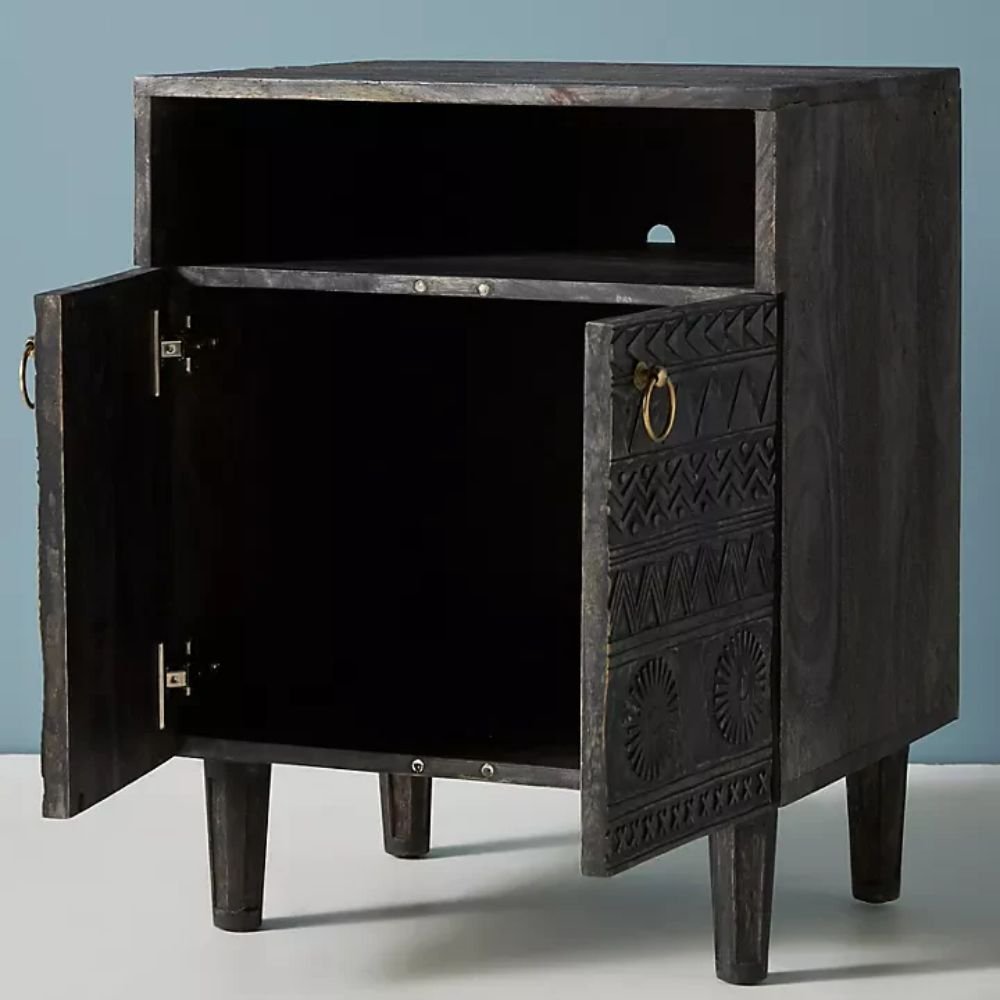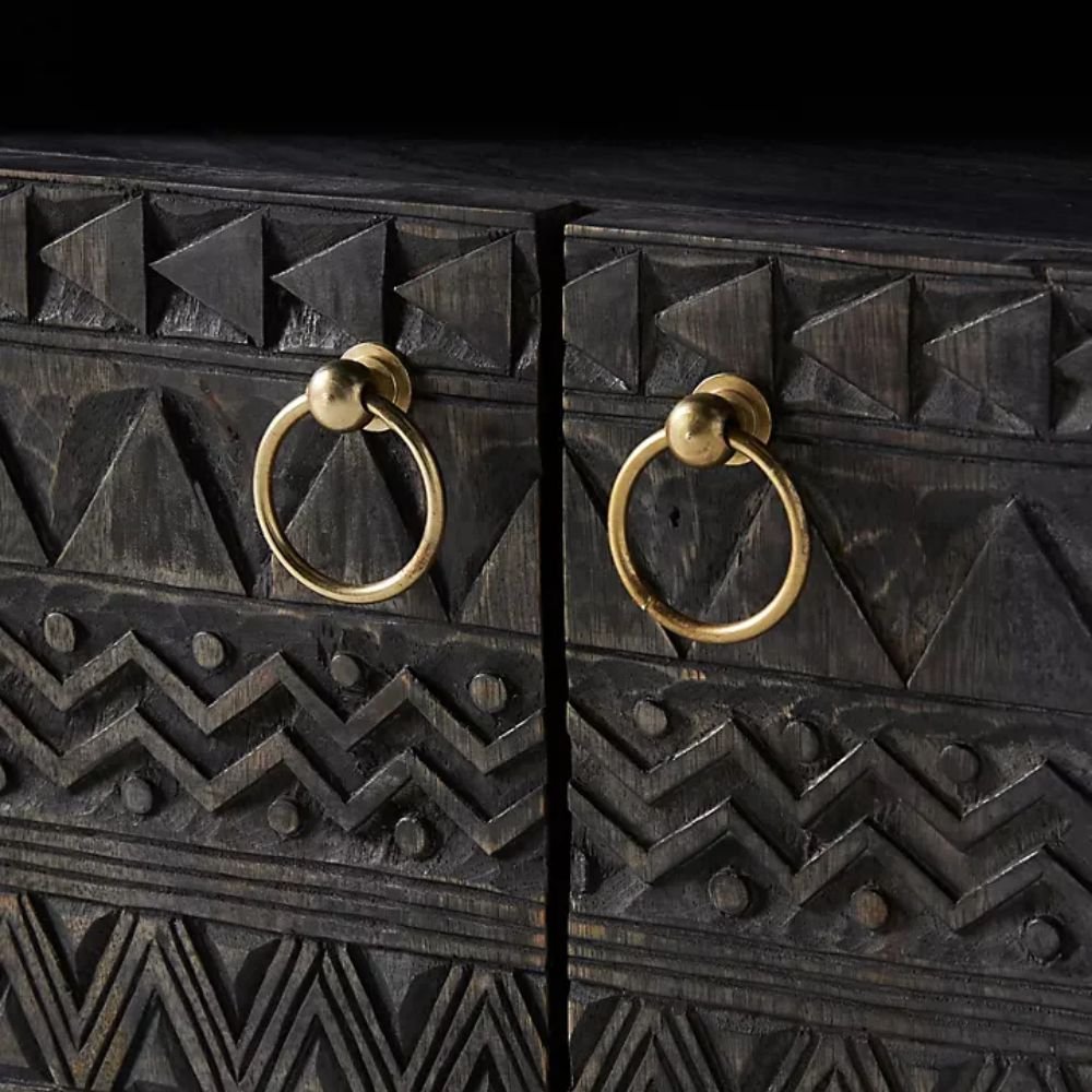 Elevate your bedroom décor with this black hand-carved wooden nightstand, showcasing bold tribal-inspired patterns across its double-door cabinet. Crafted from solid wood, this piece features an open shelf for easy access storage and a lower cabinet with brass ring handles for a refined finish.