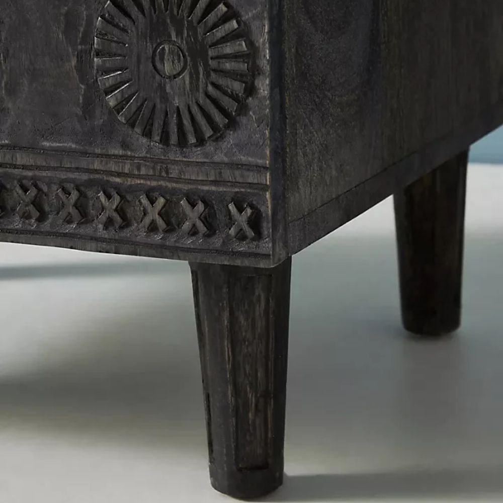 The deep black tone highlights the intricate carvings, adding texture and visual interest, while the sturdy legs ensure durability. Perfect as a bedside table, living room accent cabinet, or small media console, this versatile piece blends artisan craftsmanship with functional storage.