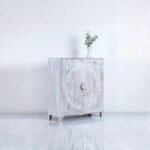 Give your home a touch of elegance and functionality with this Handcrafted White Distressed Wooden Bar Cabinet, featuring a stunning hand-carved mandala pattern on its double doors. The soothing whitewashed finish highlights the natural grains of solid wood, creating a beautifully rustic yet modern aesthetic that blends easily with any décor theme.