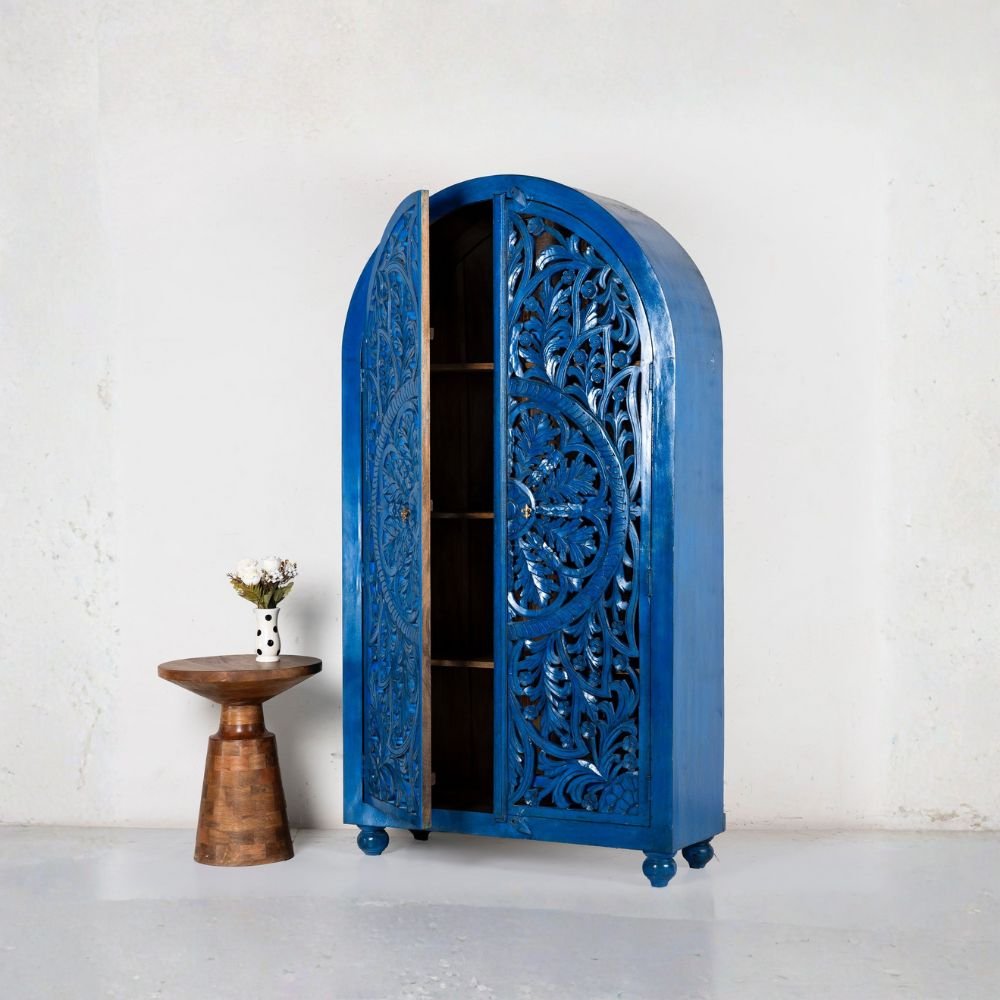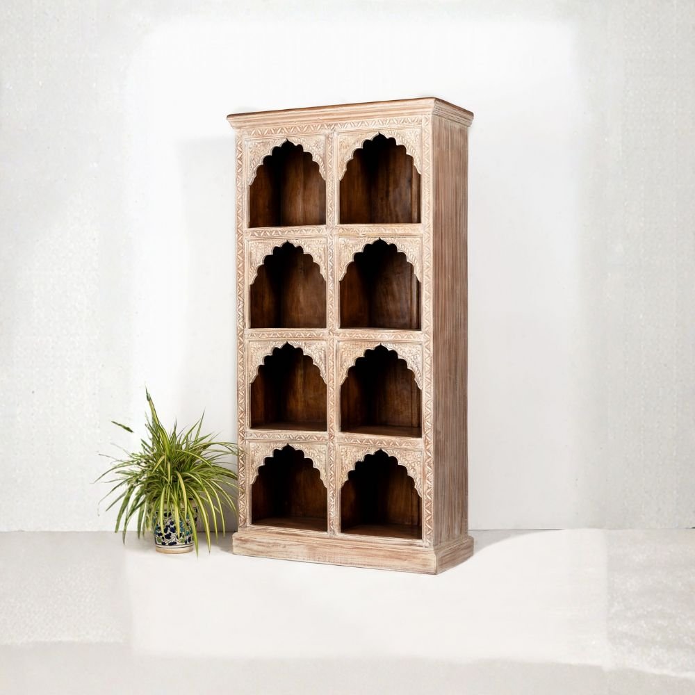 This Elegant Hand Carved Small Bookrack & Display Cabinet – Vintage Indian Wooden Storage Shelf brings home a touch of timeless Indian craftsmanship with this beautifully hand-carved small bookrack and display cabinet. Crafted by skilled Jodhpur artisans, this piece showcases intricate arch-inspired carvings, a distressed vintage white finish, and two open shelves perfect for styling your favourite books, décor accents, candles, or small collectibles.