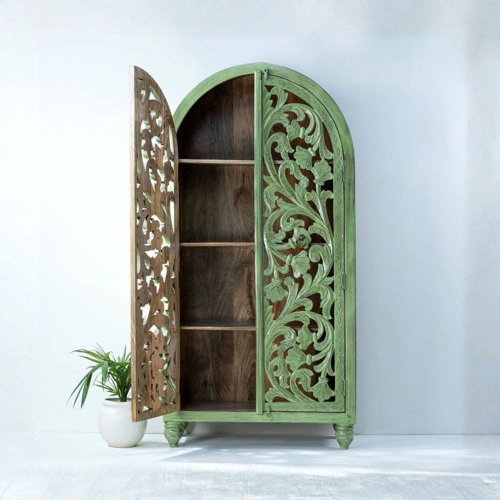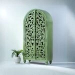 Ths Handcrafted Green Carved Wooden Wardrobe Cabinet elevates your interiors, designed in a graceful arched silhouette and finished in a soothing vintage green. Each door features intricate traditional hand-carved floral motifs, making this piece not just storage furniture, but a true work of art crafted by skilled Jodhpur artisans.