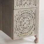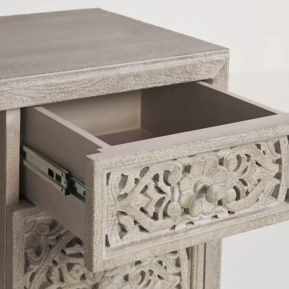 Elevate your workspace with this White washed hand-carved wooden desk, a perfect blend of functionality and artisanal craftsmanship. Featuring intricate floral carvings on the drawer fronts, this desk brings elegance and character to your home office, study, or creative workspace.