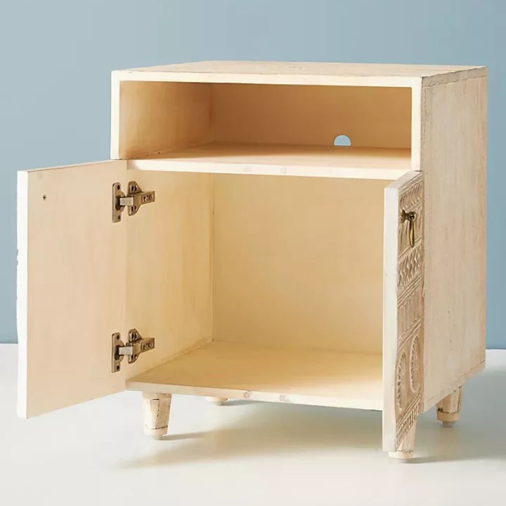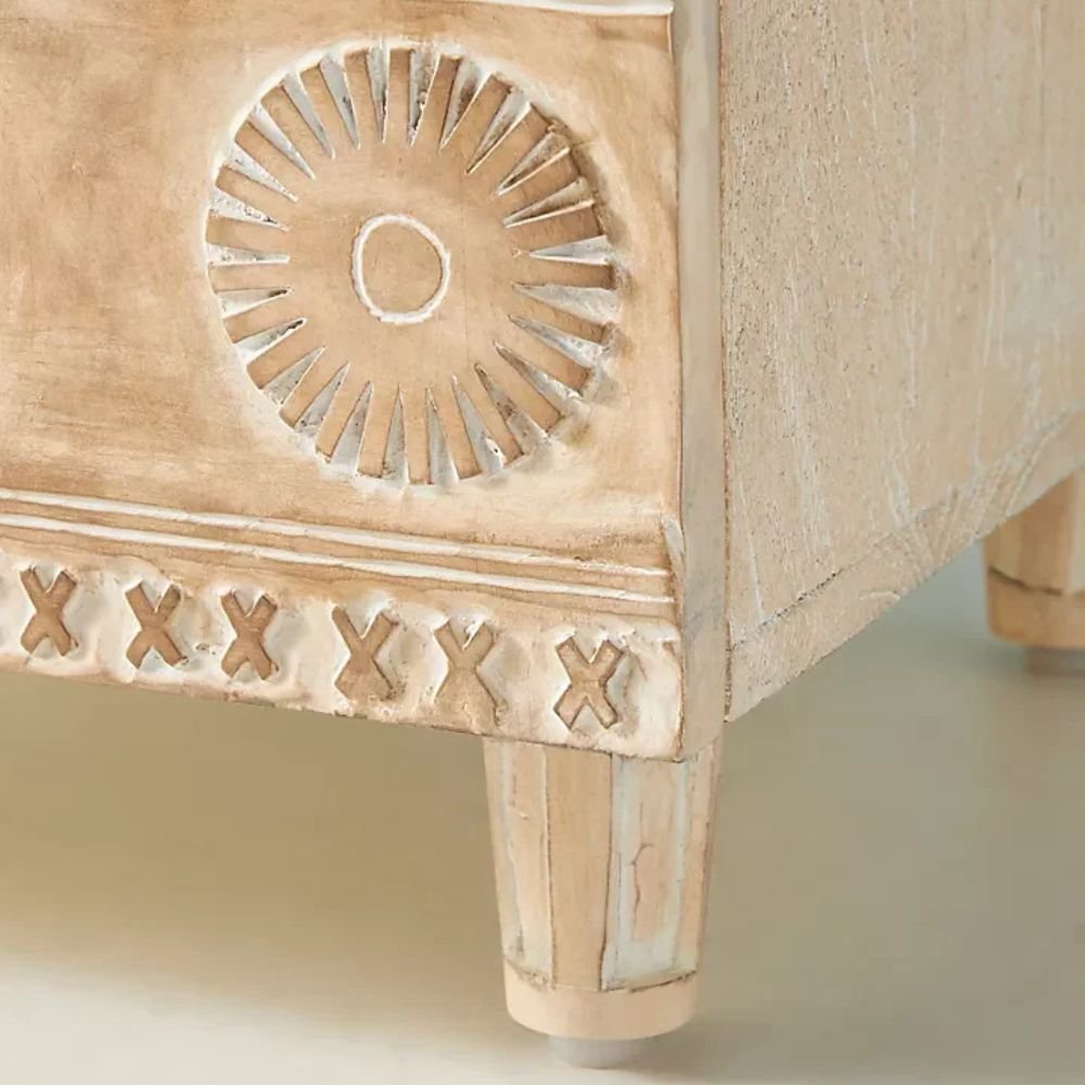This nightstand combines simplicity with craftsmanship. Its light finish brightens up your space, while the hand-carved details make it a unique statement piece. Functional, stylish, and timeless—perfect for elevating any room effortlessly.