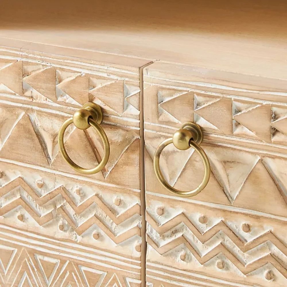 Expertly crafted by skilled artisans, the detailed carvings on the cabinet doors are complemented by minimal round knobs and a clean open shelf design. The light wood tone makes it a versatile piece that blends seamlessly with modern, Scandinavian, bohemian, or rustic décor styles.