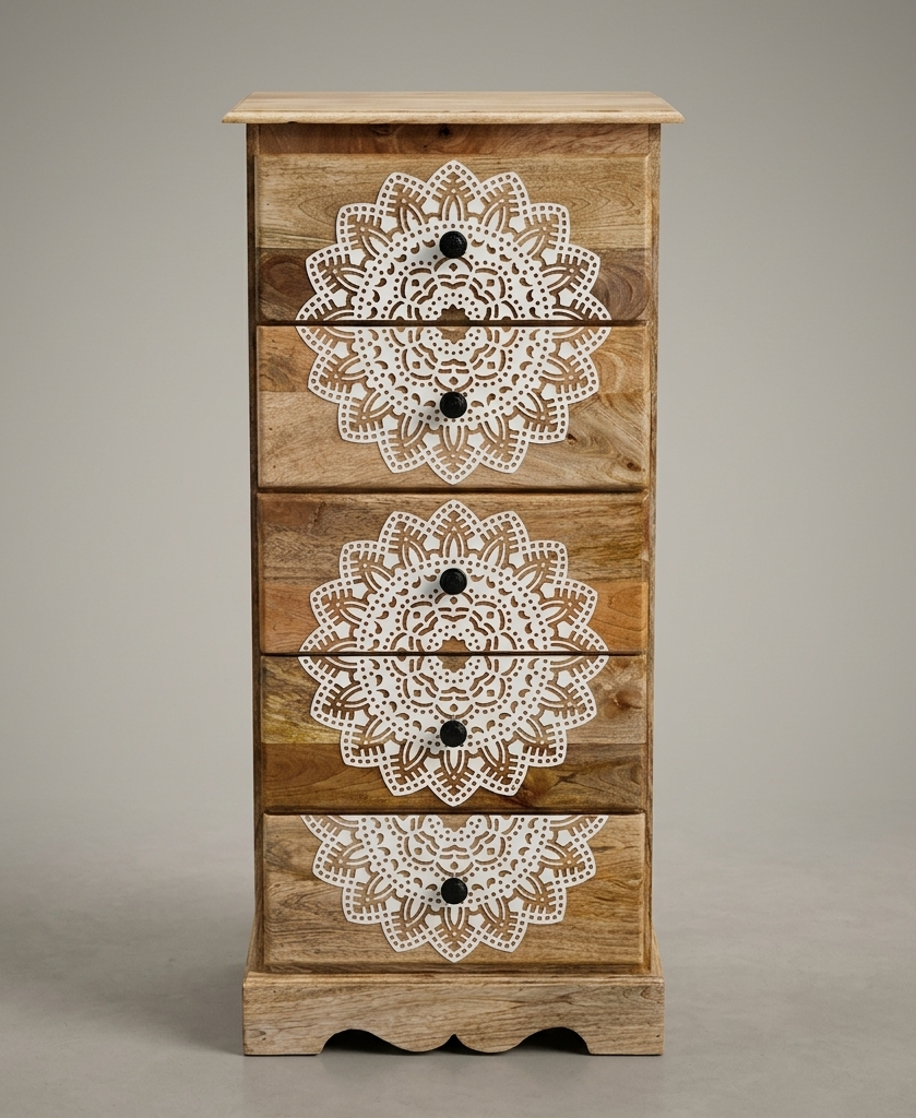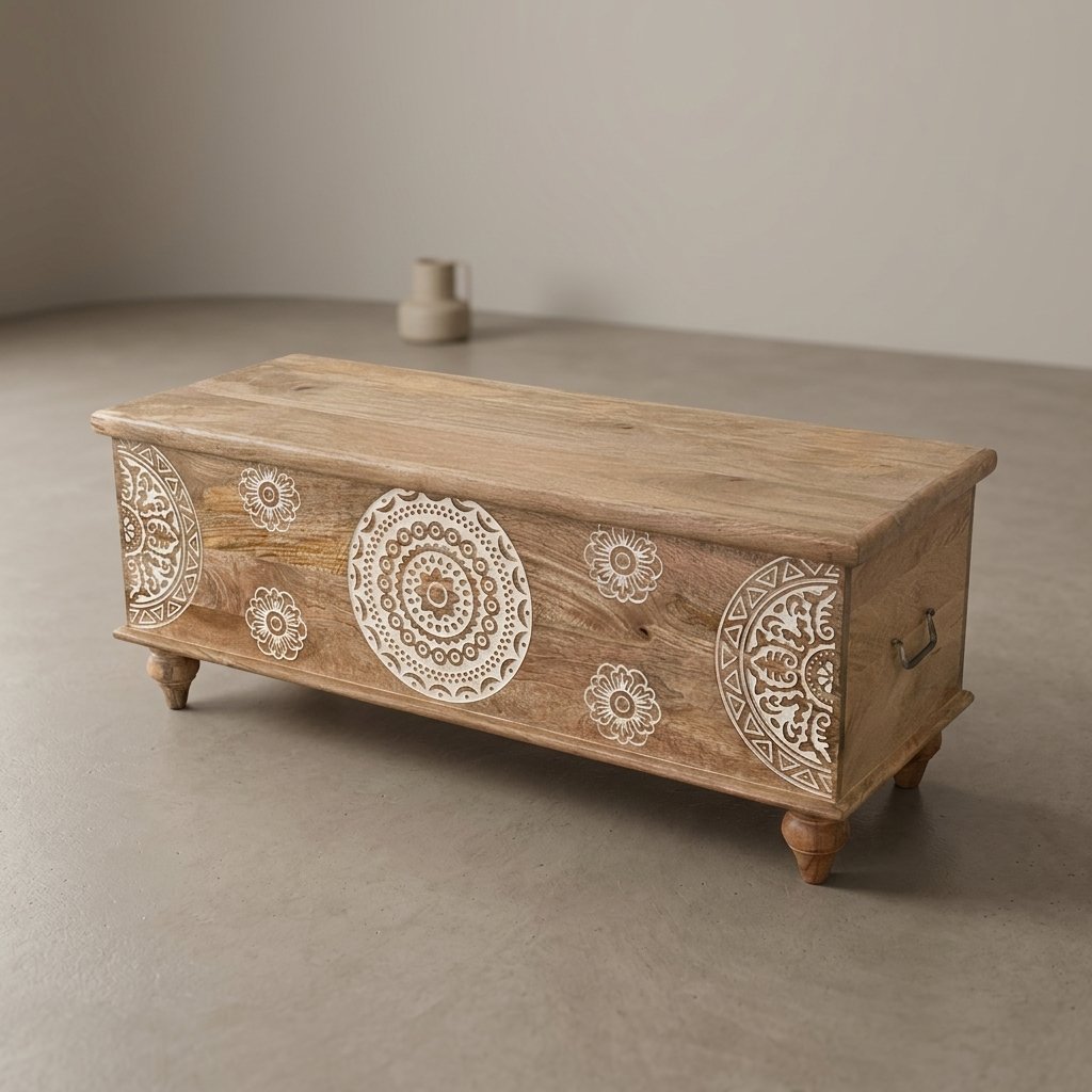 This beautifully Hand Carved Wooden Storage Chest adds timeless charm and functional elegance to your home. Featuring intricate floral and mandala-inspired carvings across the front, this piece reflects traditional artistry while maintaining a clean and versatile design.