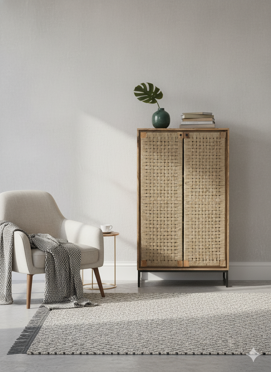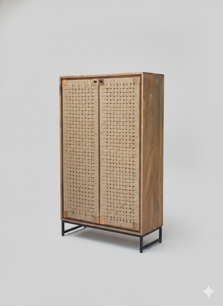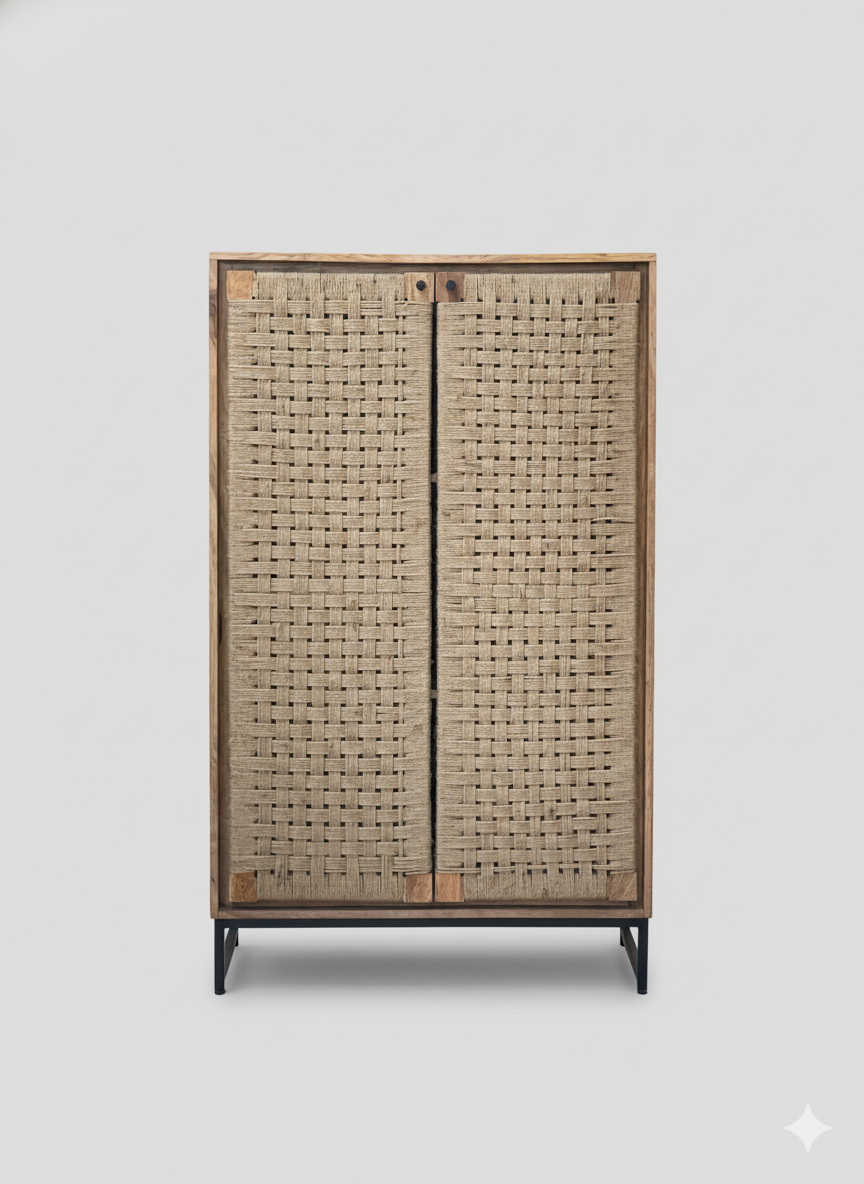 Handcrafted Jute Weave Wooden Cabinet – Boho Natural Wood Storage Cabinet with Woven Jute Doors