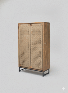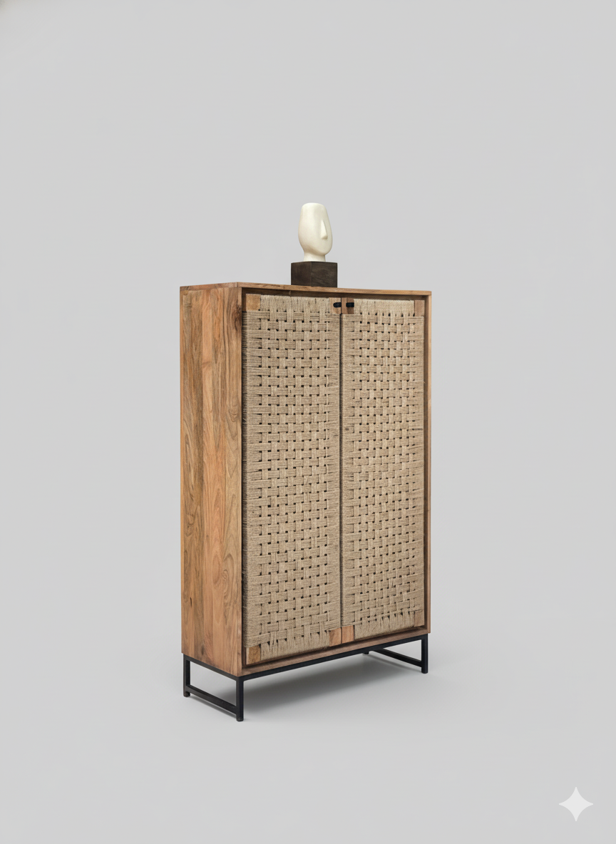 This Handcrafted Jute Weave Wooden Cabinet – Boho Natural Wood Storage Cabinet with Woven Jute Doors Add earthy elegance and functional storage to your space with this beautifully handcrafted jute-weave cabinet. Designed with a natural woven front and a solid wooden frame, this cabinet combines traditional Indian craftsmanship with a clean, modern silhouette. The tightly handwoven jute panels offer rich texture and organic charm, while providing breathable storage that keeps your belongings fresh.