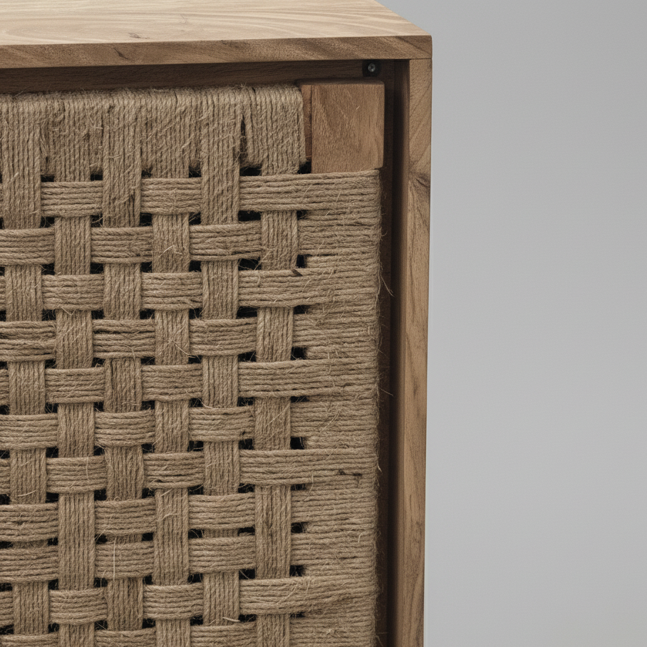 Bring natural warmth and modern craftsmanship into your home with this beautifully handcrafted jute-weave wooden cabinet. Featuring a compact, balanced design, this cabinet is crafted from premium solid wood and finished with handwoven jute panels that add rich texture and organic charm to any interior.