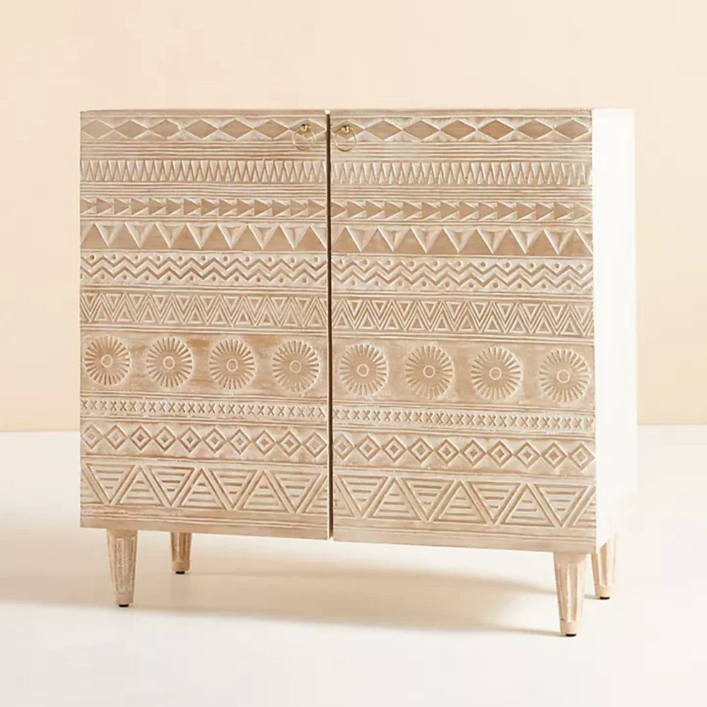 Hand-Carved Wooden Bar Cabinet with Wine Rack | Tribal Pattern Liquor Cabinet