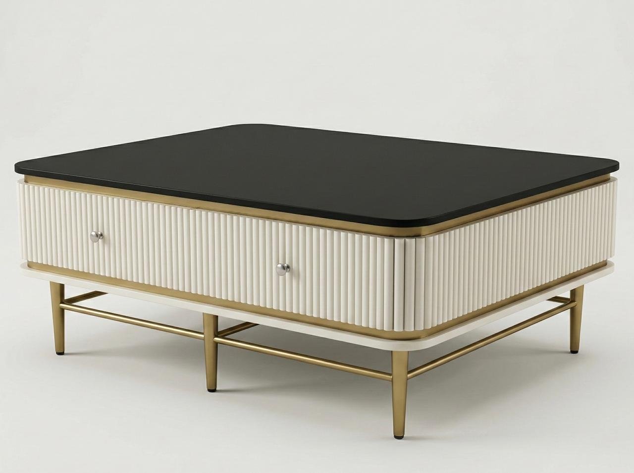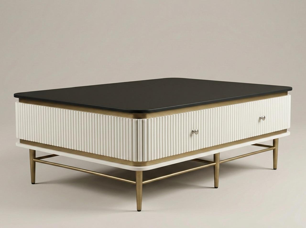 This Modern Fluted Coffee Table with 2 Drawers Add a touch of modern sophistication to your living space. Featuring a sleek rectangular black tabletop and elegant ribbed (fluted) drawer fronts, this coffee table blends contemporary style with functional storage.