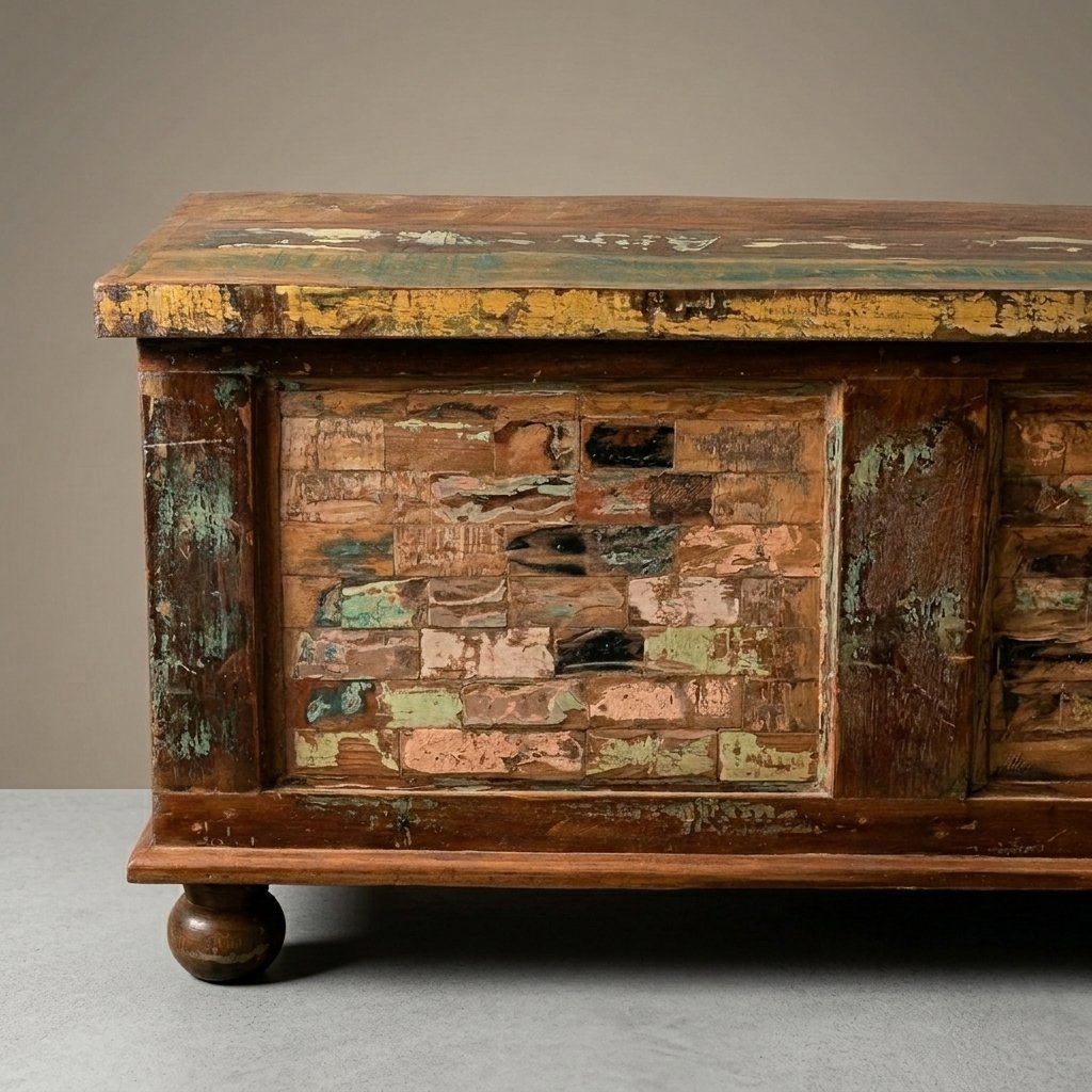 The front panels feature a rich mosaic of reclaimed wood pieces, each telling its own story through weathered textures and subtle color variations. The distressed finish and rustic appeal bring warmth and authenticity, perfect for adding depth to any interior.