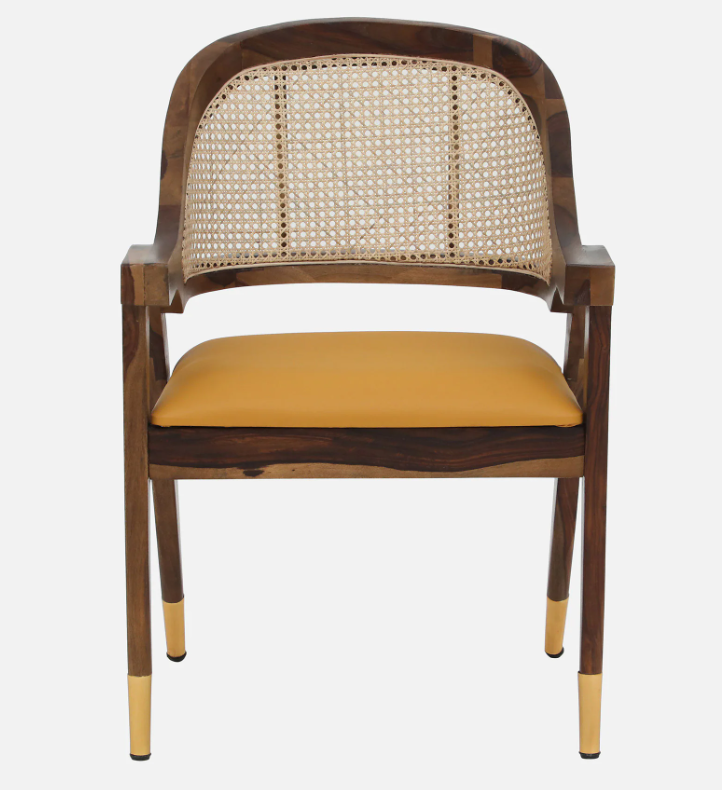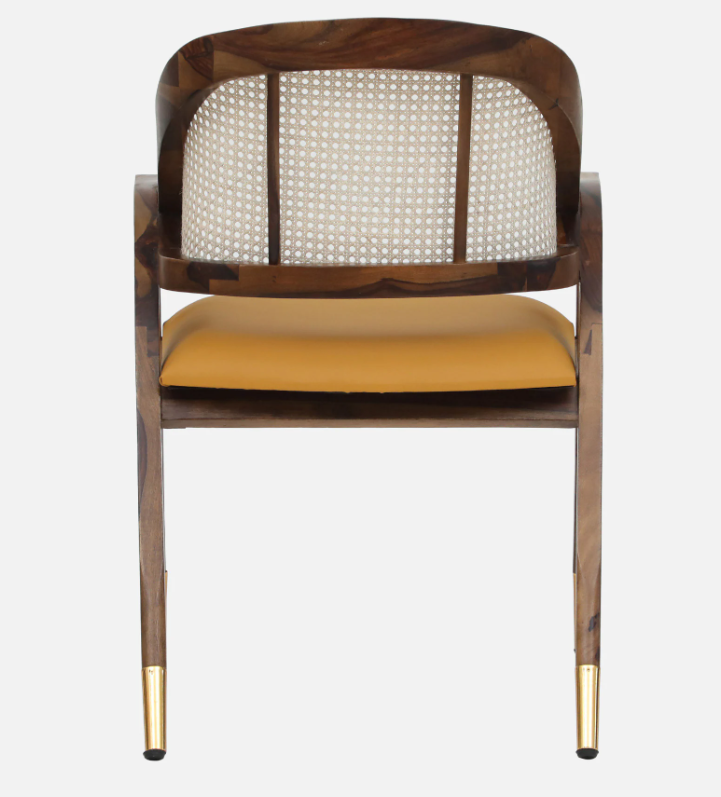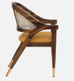 The natural handwoven cane back adds breathability and texture, while the sculpted wooden frame with brass-capped legs enhances its premium appeal. The warm walnut finish highlights the natural grain of the wood, making it a standout piece for dining rooms, upscale cafes, or boutique interiors.